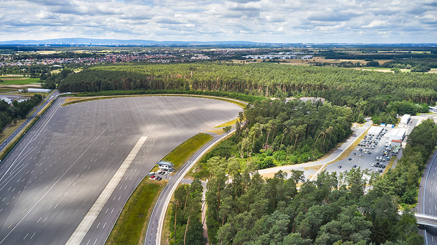 La longue ligne droite s’ouvre en forme d’entonnoir sur une aire de dérapage adjacente de 300 m, qui offre des conditions idéales pour l’évaluation des pneus, entre autres.